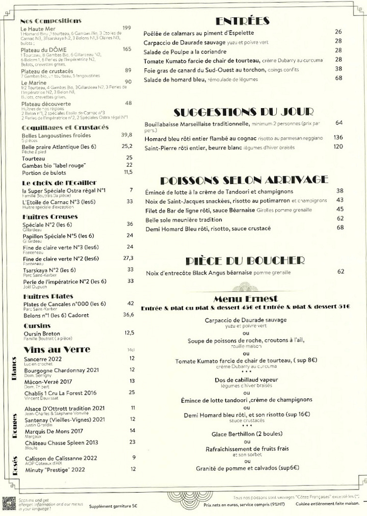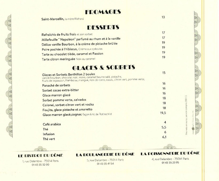 Walking through Montparnasse en route to the Dôme, every surrounding restaurant—including those along Rue Delambre and Boulevard Raspail—was packed with diners. Yet there sat the still-gorgeous Dôme, almost entirely empty save for a single couple conspicuously placed in the front window to give the appearance of activity. The reason? Perhaps, riding on its own historical coattails, the restaurant has forgotten to appease its guests with something affordable. The current menus are nearly double the prices of similar offerings nearby: