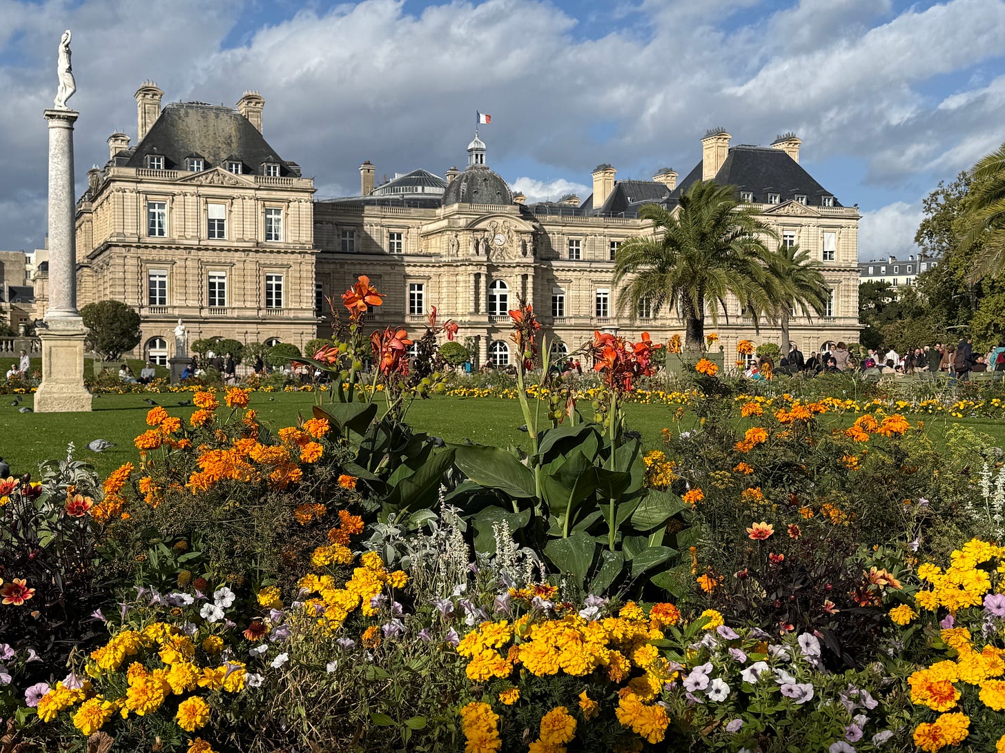 The Luxembourg Gardens are indeed a wonder, with their tree-lined walkways surrendering their leaves to autumn—the warm gold, sunny yellow, and fiery orange of the flowers invoking a sunset. The gardens have several fountains, the largest in the center where youngsters race model boats, but the most famous being the Medici Fountain, adorned with sculptures of Polyphemus Surprising Acis and Galatea.