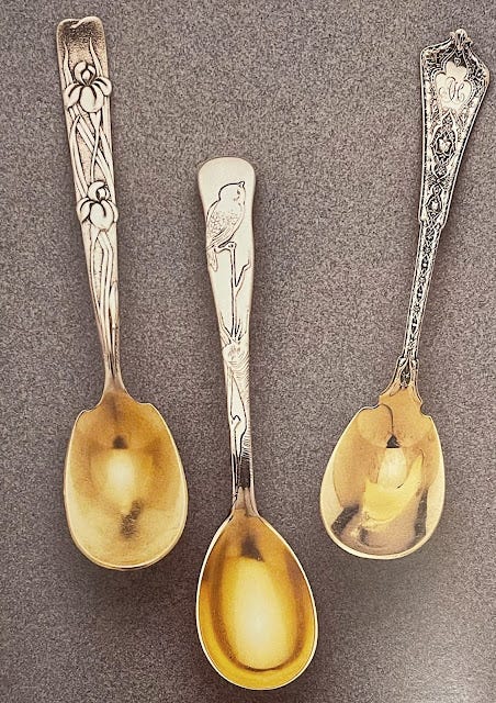 A soft-boiled egg would be served in a silver egg cups (sterling if you were wealthy enough, and plated if you just wanted to pretend you were wealthy enough). The spoon which accompanies the cup is not a standard teaspoon, but a tad smaller — usually four to five inches in length — with a slightly oblong bowl that can expertly fit into the bottom of the egg. Often, as in these Tiffany egg spoons, the bowl of the spoon would be gilded in gold to keep the spoon from discoloring that can occur from the sulfur which emanates from eggs.