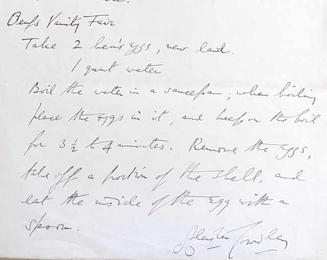 It may seem odd to write out a recipe for soft-boiled eggs, but that is exactly what Crowley did, and in a manner to elevate them with a French name, Oeufs Vanity Fair. The recipe reads: